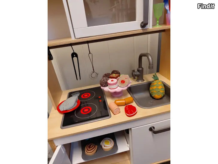Ett helt och komplett leksakskök som alltid förvarats inomhus. Allt på bilden följer med om så önskas.