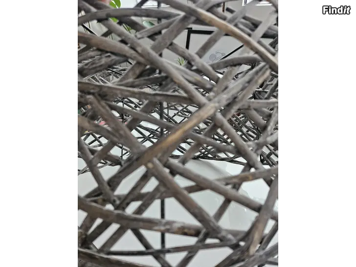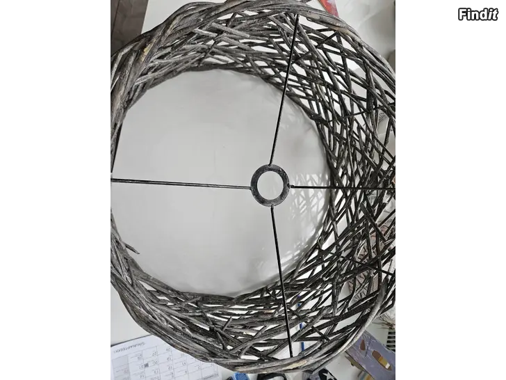 Grå lampskärm från Mookis. Materialet är trä, typ drivved på järnstomme. Diameter nertill är 50cm, upptill 42cm.