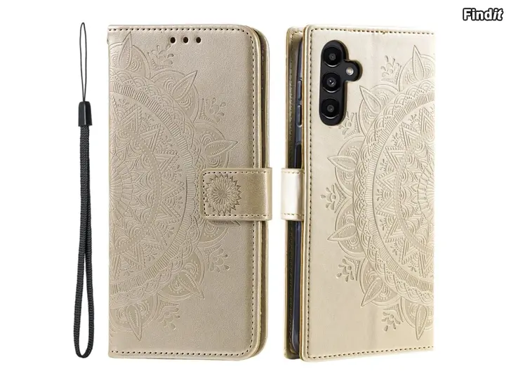 Kullanvärinen suojakotelo Samsung Galaxy S26 puhelimeen, jossa on upea mandala-kuvio painettuna nahkaan. Näissä kuorissa on kolme paikkaa luottokorteille, setelitasku sekä kiinnike puhelimelle. Suojakotelon avulla voit tukea puhelimen vaaka-asentoon ja katsoa esimerkiksi elokuvaa puhelimen näytöltä. Avattava kansi antaa hyvän suojan puhelimen näytölle.