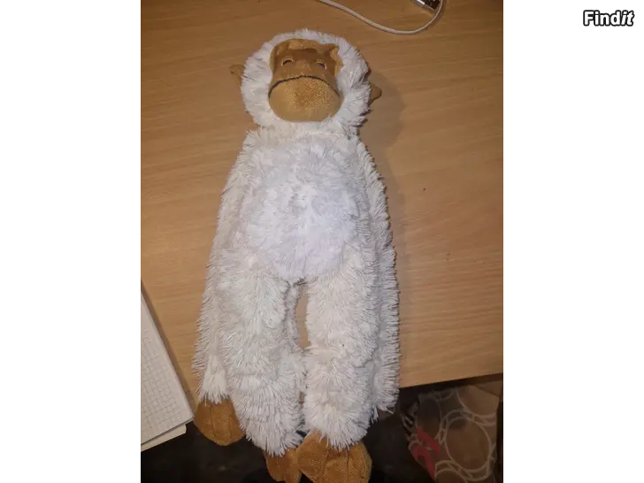 Söt mjuk apa som gosedjur med vit fluffig päls och bruna detaljer på ansikte, händer och fötter. Långa armar och ben, perfekt att krama eller ha som dekoration. Tillverkad i mjukt tygmaterial.
