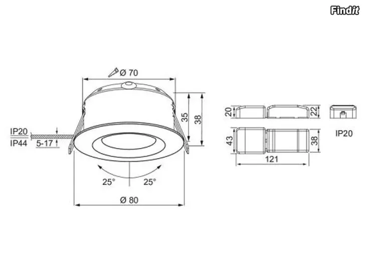 Suunnattava upotettava alasvalo Säätö 25°. Matala malli 40 mm 230 V 5 W avauskulma 36°. 4000K 400lm Sopii kylpyhuoneeseen IP 44 Himmennettävä ja ketjutettava Väri: valkoinen Koko: 95,9 mm x 51,5 mm Upotushalkaisija: 83 – 86 mm Avauskulma 36 ° suunnattava 25°/360° Värintoisto CRI 80-89 Voidaan asentaa suoraan eristeeseen