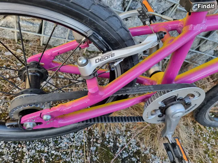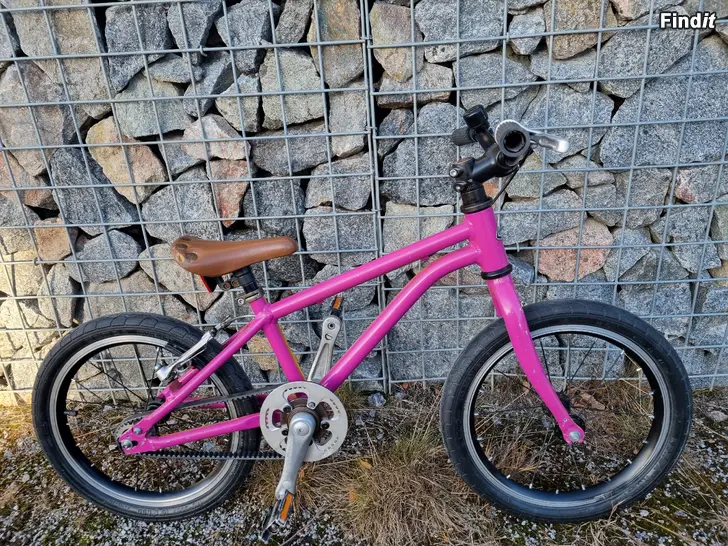 En lätt 16 tums barncykel. Den finns spår av användning och sadeln är i dåligt skick. Den har en handbakbroms och en rem istället för kedja.