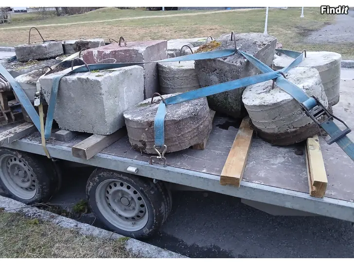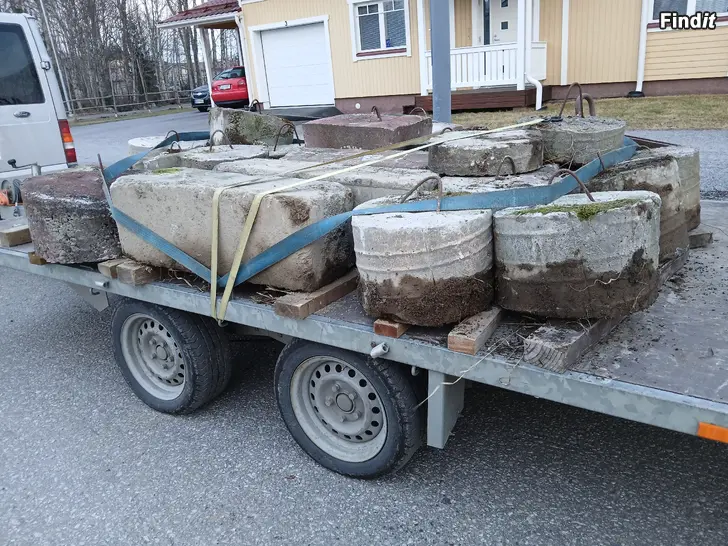 Erikokoisia/muotoisia ja painoisia joissa lähes kaikissa rautalenkit nostoa ja kiinnitystä varten. 3 kpl neliskanttisten juntta paalutuspaaluja pituudet 75-90cm. 3 kpl neliskanttisia kuutionmuotoisia noin 50x50cm. 21 kpl erikokoisia ja painoisia pyöreitä betoni alustoja. Mielellään kaikki kerralla mutta voin myydä muutaman erikseenkin hinnat alkaen 15€/kpl.