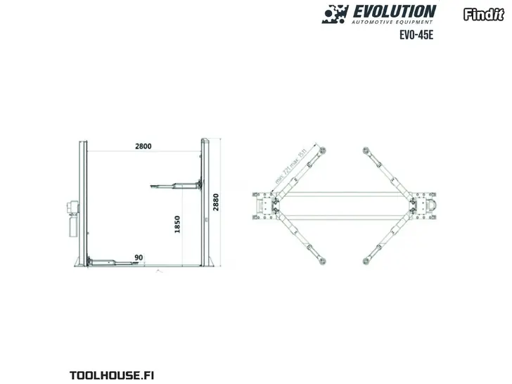 -Hydraulinen 2-pilarinostin. -Saatavana sekä 230 V että 400 V -versioina -Nostokyky 4500kg. -Pitkät symmetriset 3-osaiset nostovarret -Suuret nostotallat suurella säätövaralla -Nostokorkeus 92 – 1850 mm. -Automaattiset 24V turvalukot. -Korkeus 2880mm -230V pistorasia