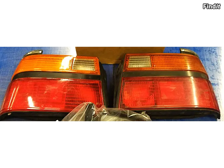 Mazda 626 1985-1987 takavalot. Vasemmassa valossa pelkkä kuori ja auton korin ja lampun väliin tuleva tiiviste. Oikeassa valossa myös lamppujen kantaosa tallessa.