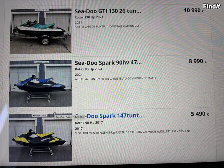 NOPEASTI VAIHTUVASTA VARASTOSTA HYVÄ KUNTOISIA SEA-DOO VESI JETTEJÄ. SVEA RAHOITUS ILMAN KÄSIRAHAA. KORKO 5,9 PALVELEMME JOKA PÄIVÄ 9-21 SOITA JA SOVI NÄYTTÖ 0443215094