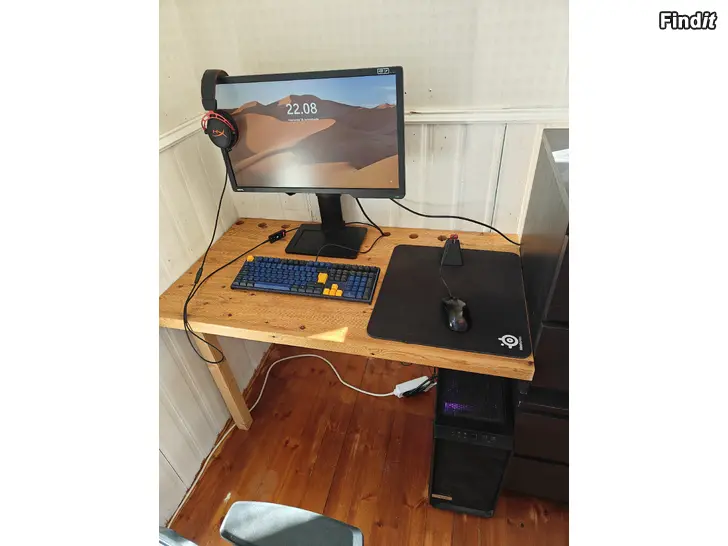 Pelikone setti jossa tietokone, näyttö, hiiri, näppäimistö, kuulokkeet sekä tuoli