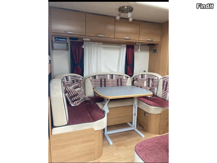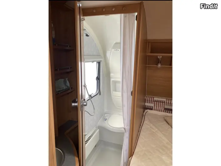Barnkammarvagn med våningssäng, bekväm dubbelsäng och bäddbar dinette. Toalett med kasset samt dusch.