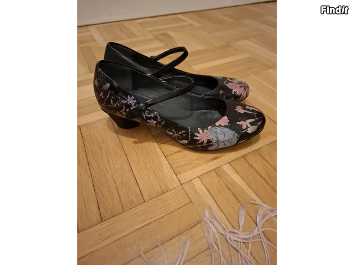 Mustat nahkaiset kukkakengät, joissa nilkkaremmi nappikiinnityksellä, koko 36 vähän käytetyt