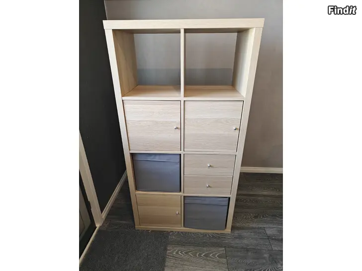 Myydään Kallax-hylly. Mukaan kuuluu kaksi harmaata koria, kaksi laatikkoa ja kolme ovea. Hyvässä kunnossa, ei kulumia.