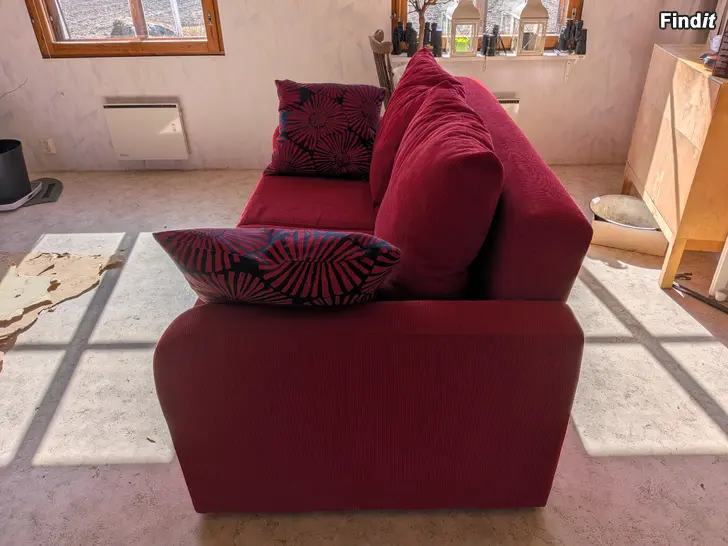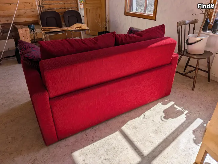 Röd bäddsoffa. 160 cm bred och 90 cm djup.