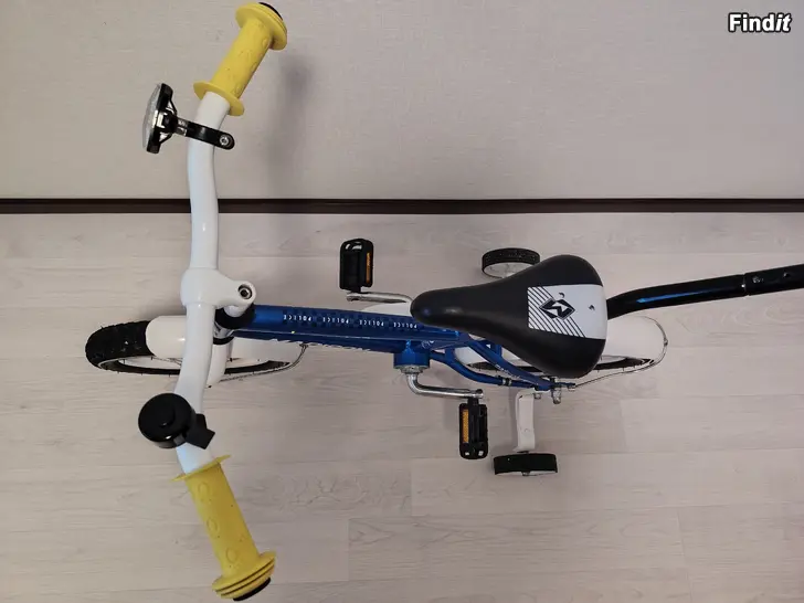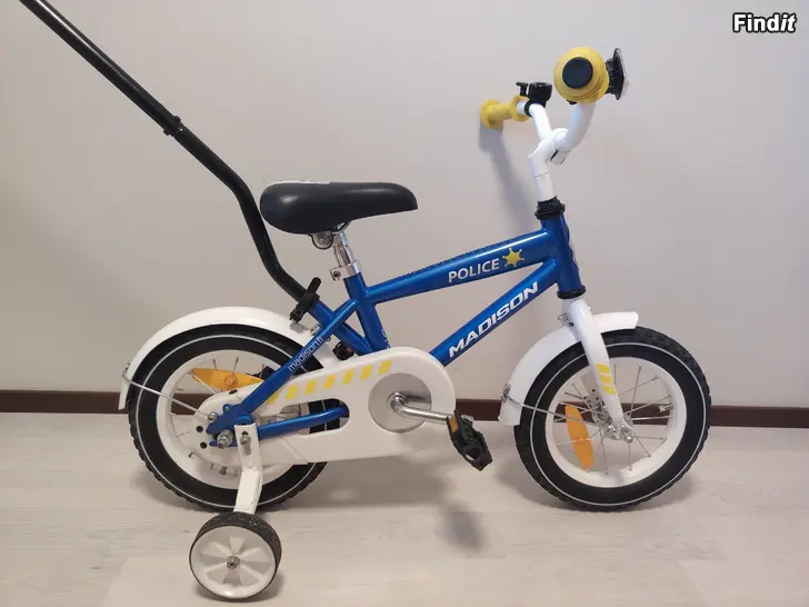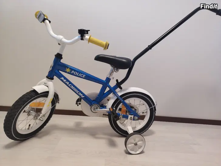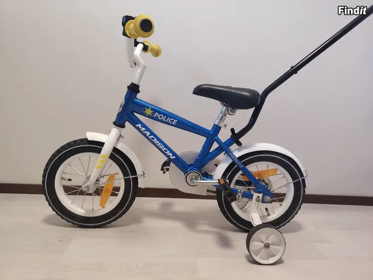 MADISON 12 Police poikien pyörä. 1-vaihteinen, jalkajarru, heijastimet, säädettävät apupyörat ja runkokiinnitteinen työntötanko. Pyörä on siisti ja hyvässä kunnossa.