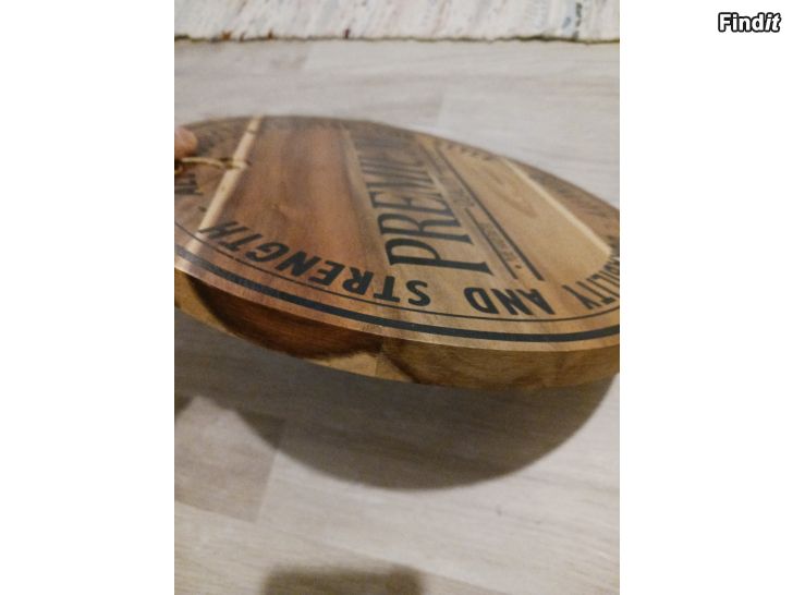 Pari kertaa käytetty juustotarjotin Halkaisija 28cm akaasiapuusta valmistettu ripustus narulla Paksuus 1,5cm