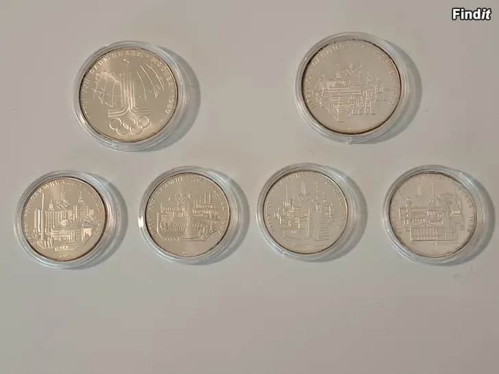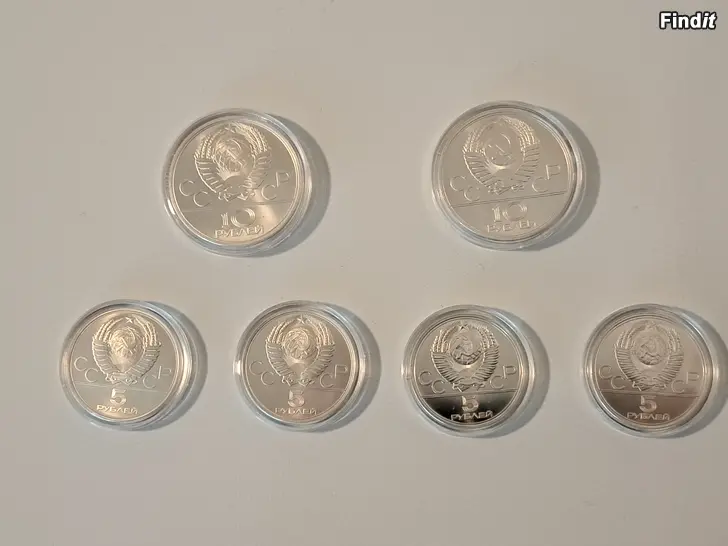 Moskovan olympiakisojen rahasarja, jossa 2kpl 10 ruplan sekä 4kpl 5 ruplan hyväkuntoisia hopearahoja.