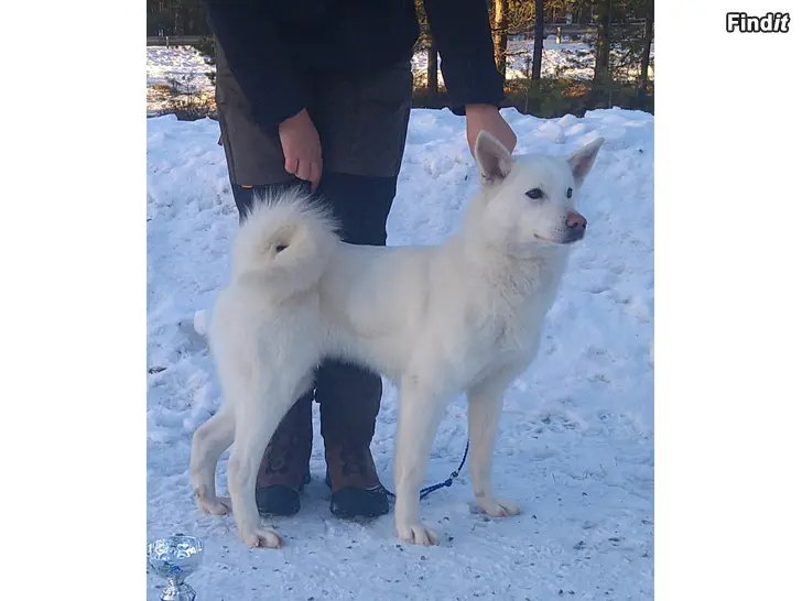 Av rasen vit svensk älghund. Van att bo både i hundgård och inne.