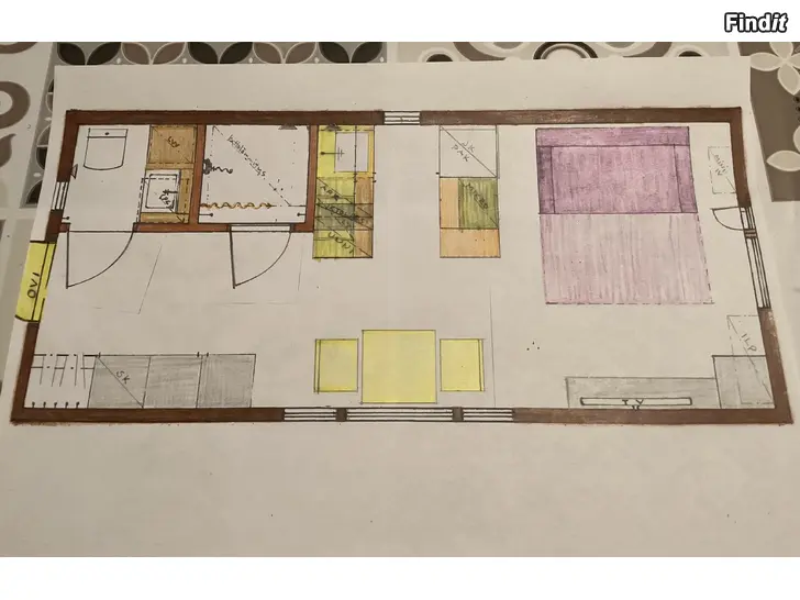 Sisämitat noin 7m x 3m, sisäkorkeus noin 2,3m. Sisällä huonetila, wc ja suihku.
