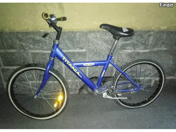 For sale in Helsinki : Boys bicycle for a boy who is 110-125 cm tall. 1990s bike. Bike has 20 inch tires. Single-speed childrens bike with foot brake. Brand: Titania Top Gun. Color: blue. The bike needs a little service before riding. The rubber on the rear tire has already started to wear out. You can easily replace the tire with a Jopo, Kombi or Grape 20 tire, it is the same size. You can buy this tire from Prisma for example. The bike is otherwise fully usable. In Helsinki.