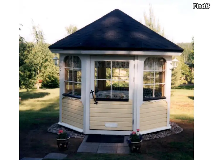 8-kulmainen.Halkaisija 3 m. 7 neliötä.Uusi elementtipaketti .Sisältää tukevan kantavan lattian .Voi kuljettaa peräkärryssä