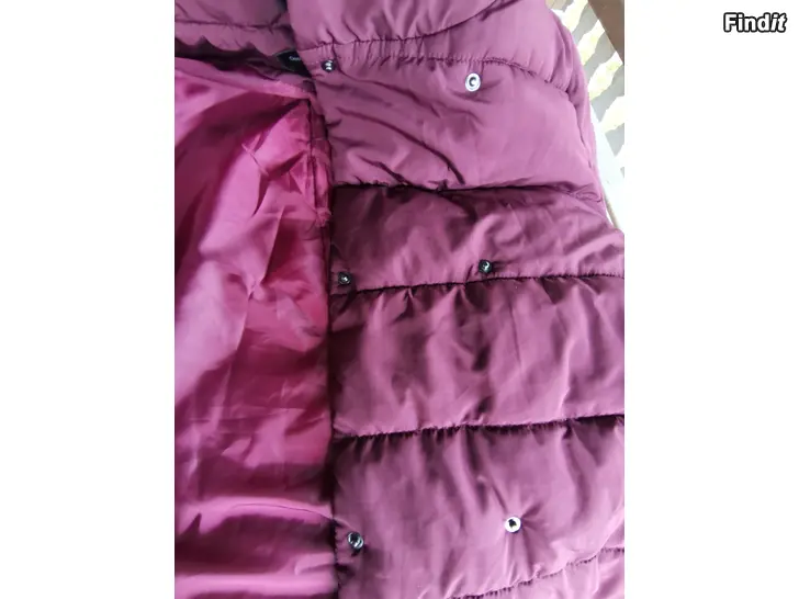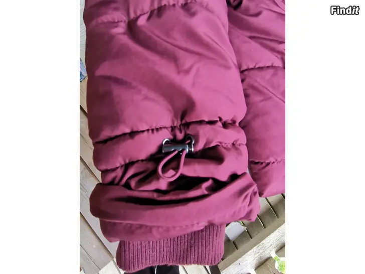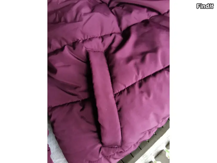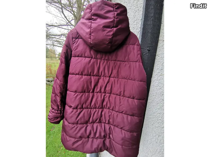 Uudenveroinen muhkea toppatakki, jossa kahdet nepparit, huppu, kaksi taskua sekä hihoissa kiristysnyörit ja resorit. A-mallinen, väri luumunpunainen. L koko merkitty, mutta on reilun kokoinen, ehkä XL. Mitat kai-kai 65 cm ja olka-helma 88 cm
