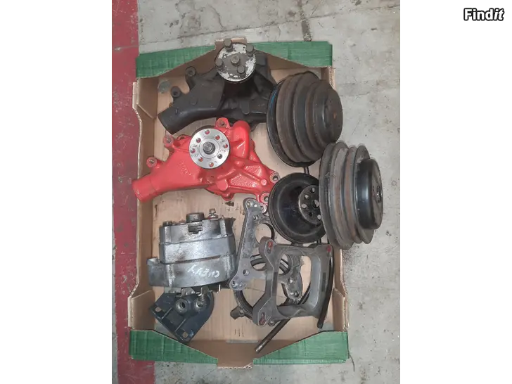 Läjä tarpeettomana. HEI jakajat non single wire ei varmuutta toimiiko, vesipumppu ehjä, hihnapyöriä,sytytyspuolat. Mr. Gasket kaasarin ja imusarjan adapteri. Kuvassa näkyvät osat kaikki kerralla.