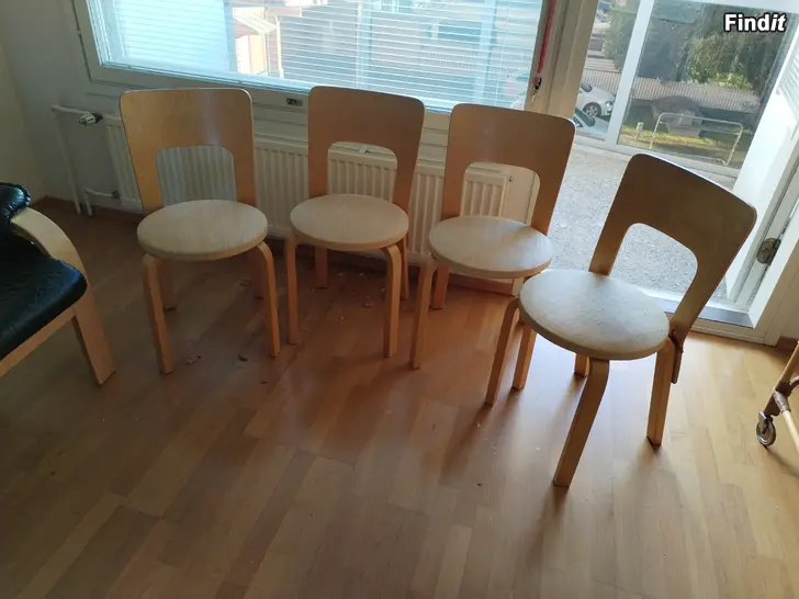 Ikäisekseen hyvässä kunnossa ja siistit mutta siihen nähden sanon rehellisesti että paikoin ikä näkyy. Päällys siisti. Päällys ei puinen. Hinta ilmoitettu neljästä tuolista ja huomioitu ikävähennys.