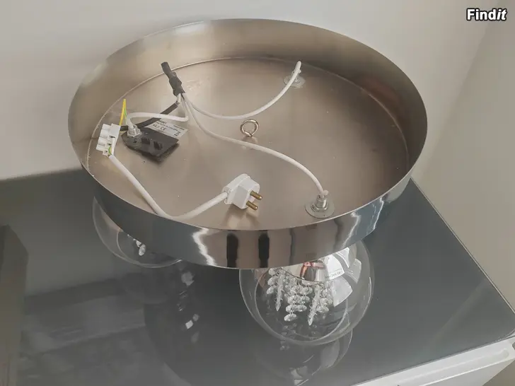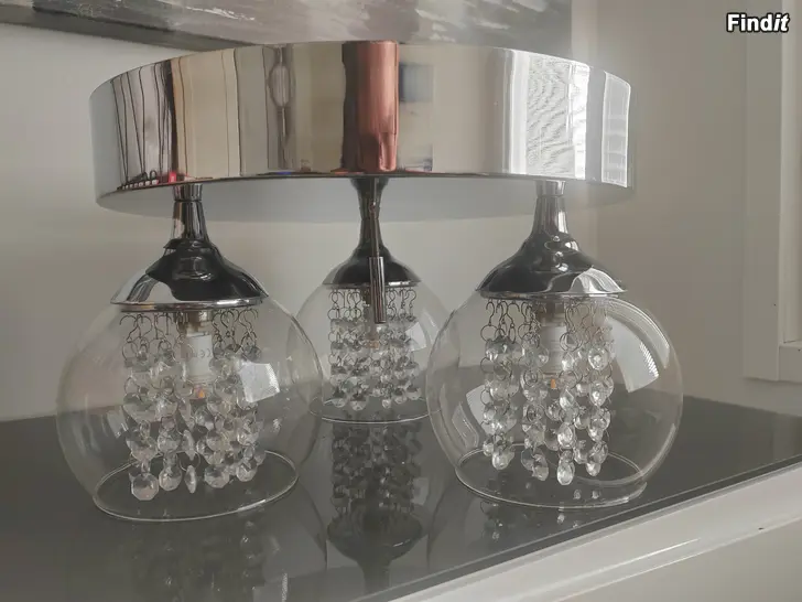 Valo heijastuu laskikoristeiden ja kirkkaiden lasipallojen kautta, kromattu runko viimeistelee vaikutelman. Asennusta helpottaa kätevä kattokoukkukiinnitys ja pistoke.