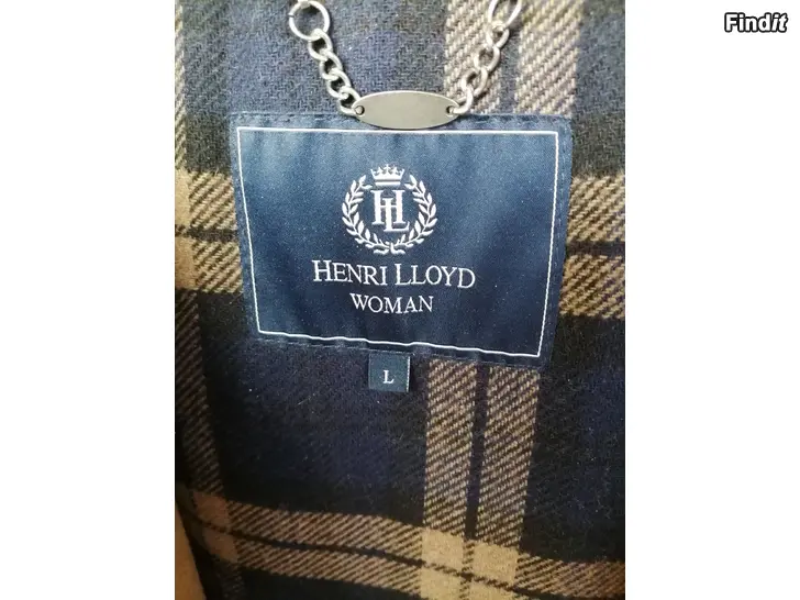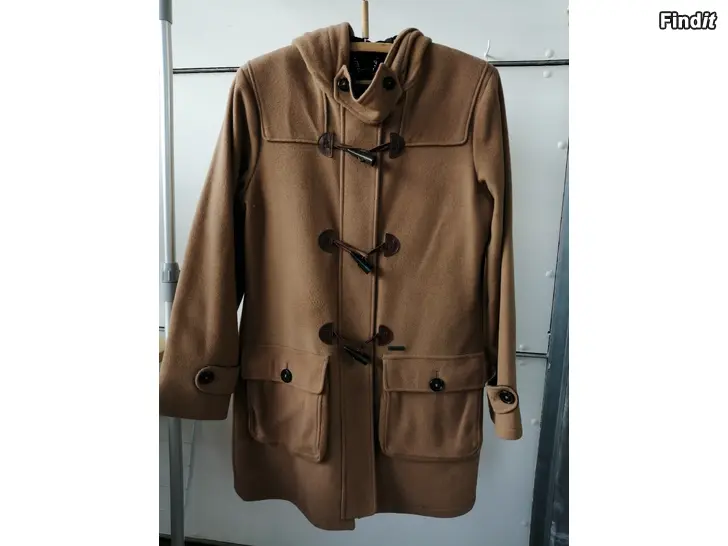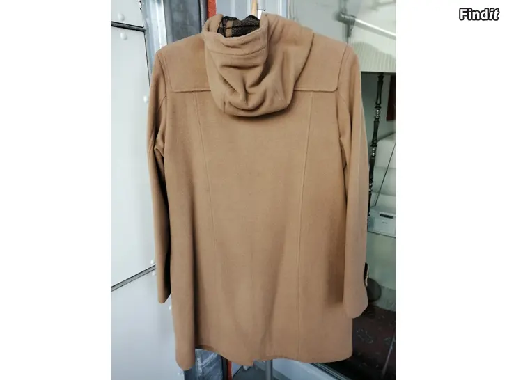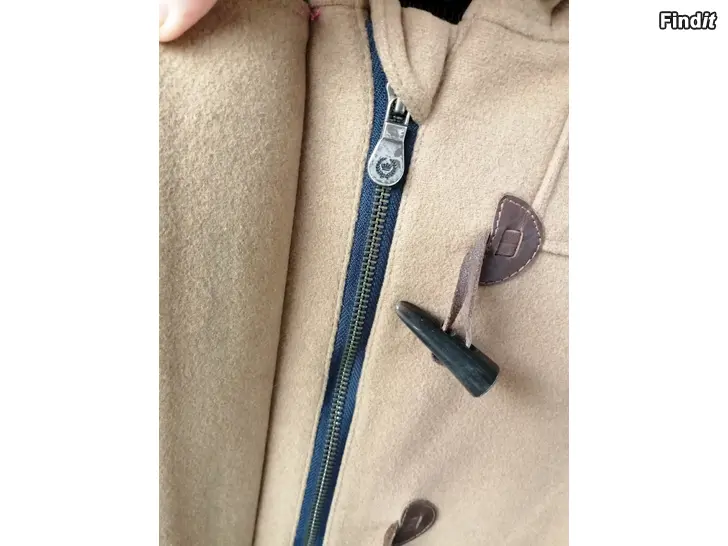 Klassinen leijonanvärinen duffeli. Pituus niskasta helmaan 78 cm, selän leveys 56 cm, hihan pituus 51cm. Kokomerkintä L, Lruudullinen vuori, kiinnityksenä sekä vetoketju että perinteiset duffelinapit. Huppu.