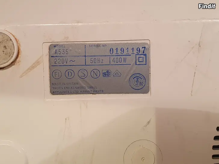 Vanha Kenwood Gourmet -yleiskone, malli A535. Todennäköisesti valmistettu joskus 1980-luvun puolivälissä. Toimii yhä, mutta ääni ei ole hyvä käytettäessä – kuuluu rahisevaa ääntä erityisesti alhaisilla kierroksilla. Käsistään kätevä saa varmasti korjattua. Yleiskoneen kulhossa on kaksi muovivauriota, jotka eivät vaikuta toimintaan katso kuvat. Mukana tulee terä ja kolme hyväkuntoista viipalointilevyä. Sijaitsee Pedersöressä. Lähetä viesti, jos haluat koneen postitettuna.
