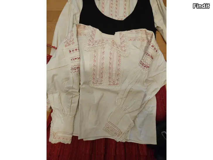I helheten ingår två skjortor, kjol, skor storlek 5,5, mössa och förvaringspåse. Storlek ca 38-40.