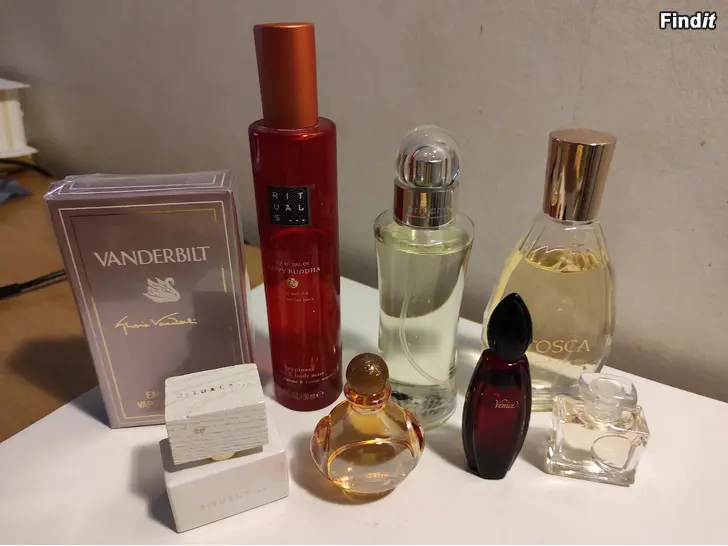 Hajuvesiä settinä edullisesti. 1 kpl uusi, muut yli 60 täynnä. Valkoisesta pullosta ei näy läpi joten siitä en tiedä kuinka paljon jäljellä.
