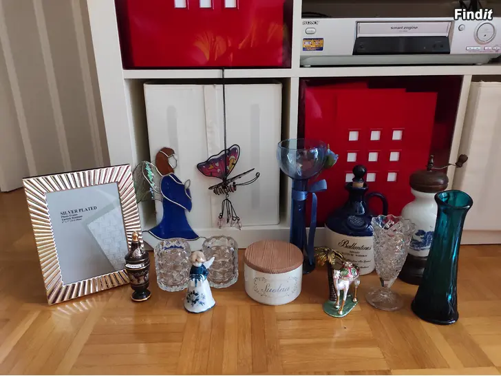 Lasi ja posliini esineitä settinä edullisesti. Sis lasi-enkeli,Posliini enkeli-kello, Lasinen kynttilänjalka, Keraaminen karahvi, Antiikkinen Hollantilainen pippurimylly, Pentikin suolapurkki , Suomalainen antiikki-maljakko, Hopeoitu valokuvakehys, koristeellinen kameli-koriste, kristalli maljakko ja kaksi lasisia tuikkuja ym. Myydään muuton vuoksi nyt todella edullisesti. Mieluiten nouto