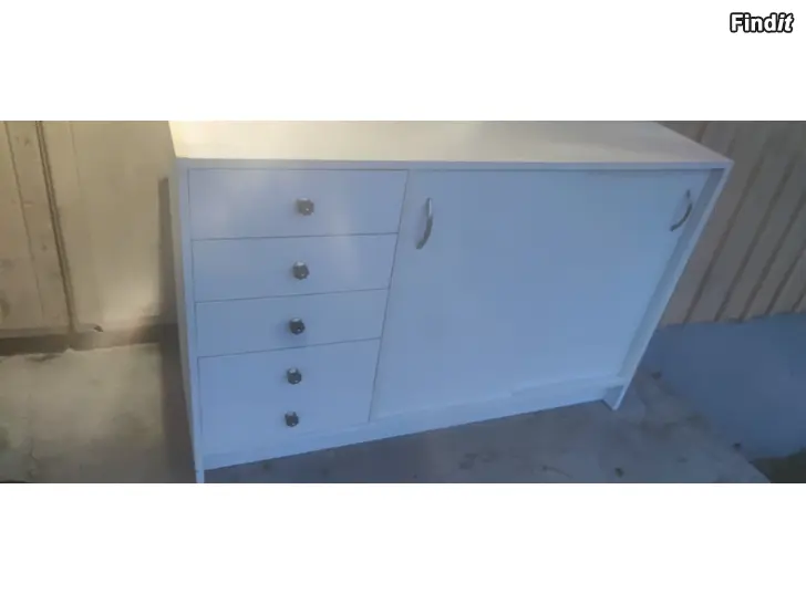Valkoinen kaappi vetolaatikoilla ja liukuovella