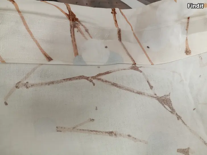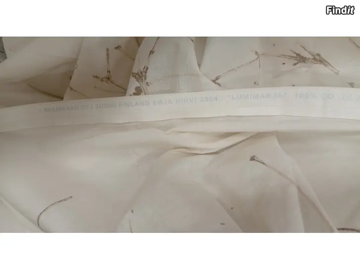 Marimekon Lumimarja kankaasta ommeltu verho.