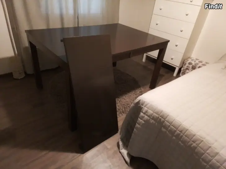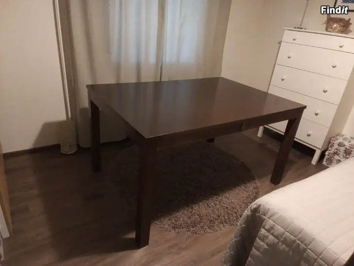 Myydään tummanruskea ruokapöytä. Mitat: pituus 140 cm, leveys 95 cm, korkeus 75 cm. Jatkopala 40 cm. Pinta maalattu ja lakattu ammattilaisen toimesta noin 3 vuotta sitten, alkuperäisen värin ja pintakäsittelyn mukaiseksi, sen jälkeen pöydän kannen suojana pidetty muoviliinaa. Pöytä tukeva ja hyväkuntoinen.