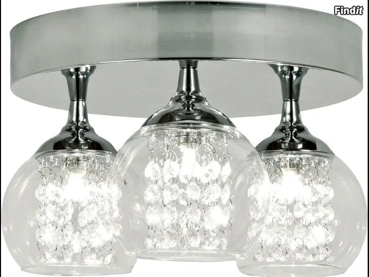 Valo heijastuu laskikoristeiden ja kirkkaiden lasipallojen kautta, kromattu runko viimeistelee vaikutelman. Asennusta helpottaa kätevä kattokoukkukiinnitys ja pistoke.