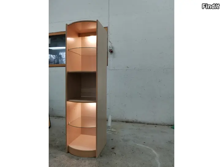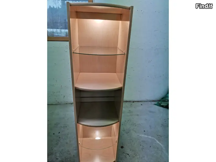 Vitriinikaapissa on kolme puuhyllyä, kaksi lasihyllyä ja kaksi valoa. Puolivälistä irtoaa kahteen osaan, joten se on helppo kuljettaa. Hyvä kunto. Mitat: korkeus 160 cm, syvyys 40 cm, leveys 42 cm.