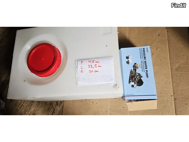 Käyttämätön vesisäiliö ja 12v painepumppu