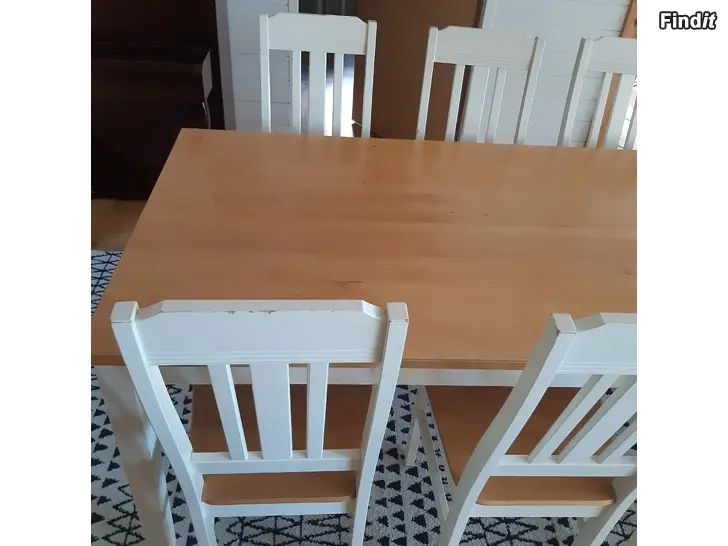 Ruokailuryhmä kuudelle. Pituua 170 cm. Leveys 90 cm. Korkeus 74 cm. Massiivikoivua. Kestää käyttöä. Pöydän pinta on hyväkuntoinen. Maalatuissa osissa käytön jälkeä ja ajan patinaa.