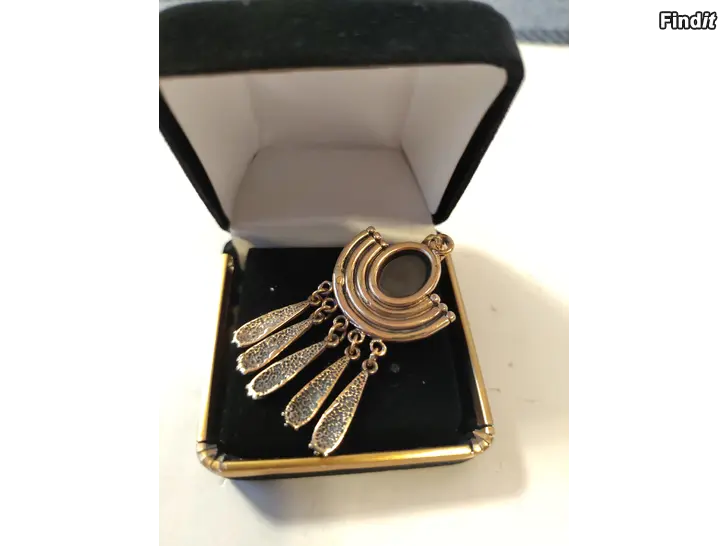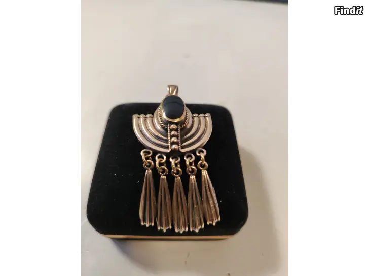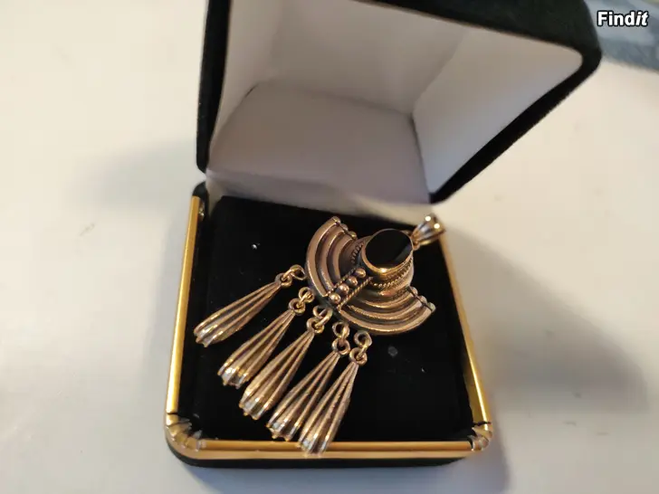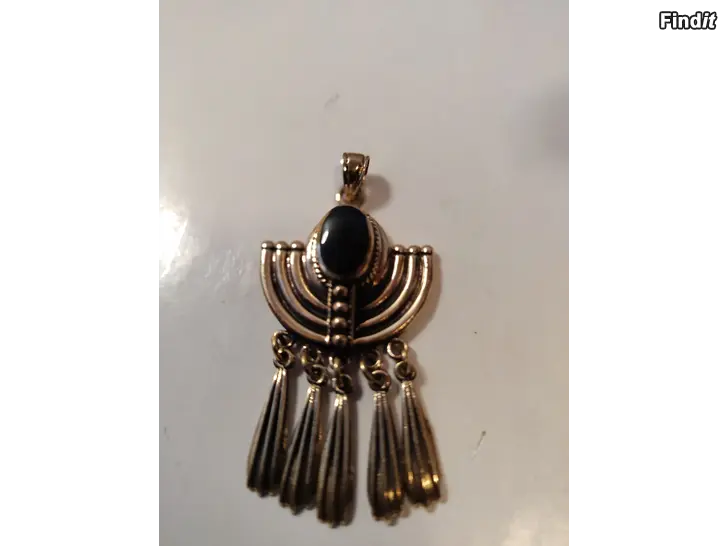 Tässä uusi, näyttävä kaunis riipus. Mielestäni se on kullattua pronssia ja että korussa oleva musta kivi olisi Onyx-kivi.
