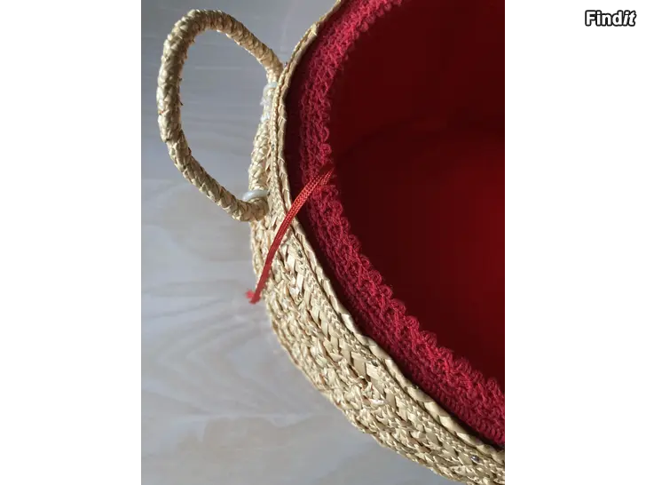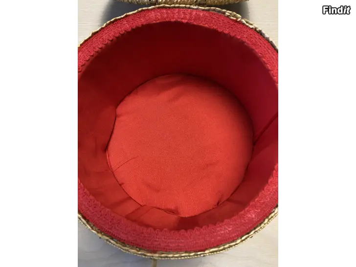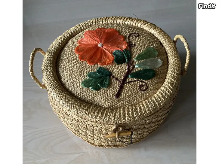 Myynnissä kuvan retro ompelukori sisältöineen tai ilman. Made in China, mutta vanha ja edelleen erittäin hyvässä kunnossa. Ainoa puute on että naru jonka varassa kansi pysyy pystyasennossa on irronnut kts kuva, mutta edelleen kiinni toisesta päästä, eli sen voi halutessaan korjata. Mitat: korkeus 12 cm ja leveys noin 22 cm. Hinta 35 €.