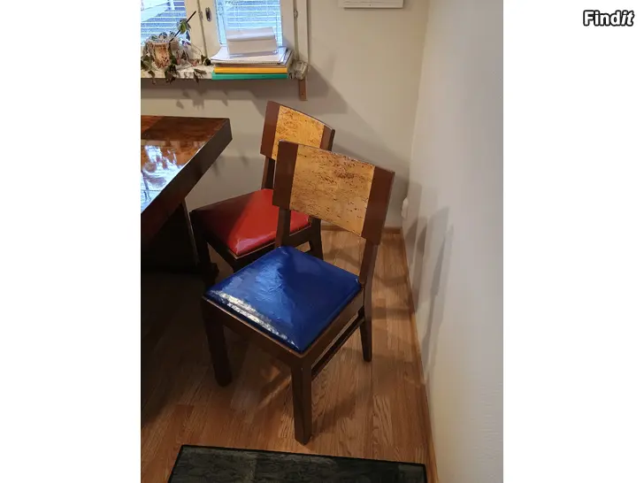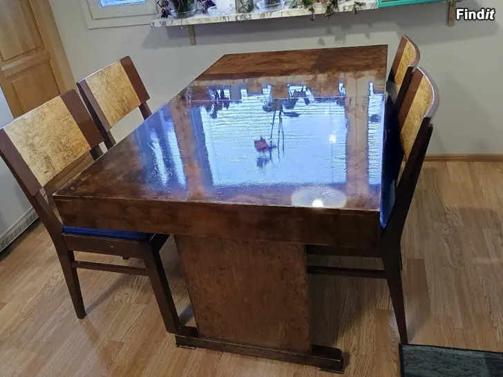 Kuvan keittiön pöytä ja 4 tuolia. Tuolien selkänojat ovat visakoivua.