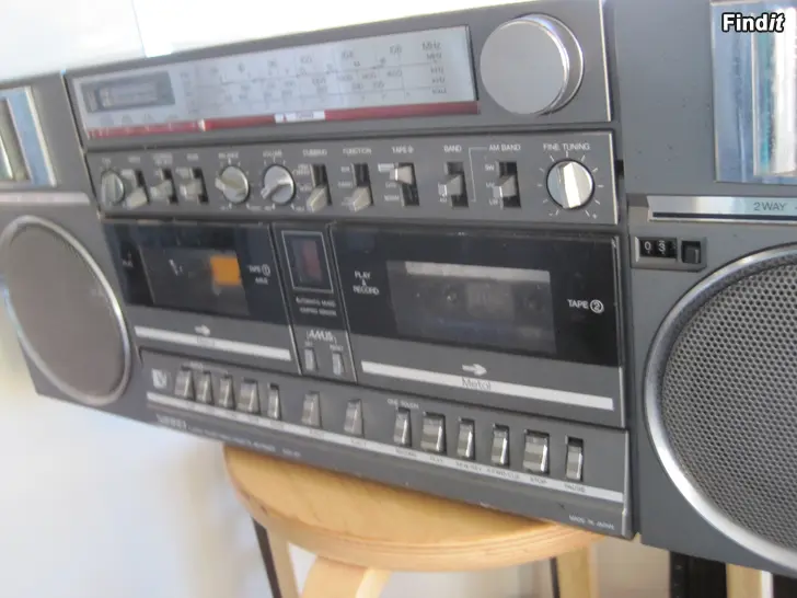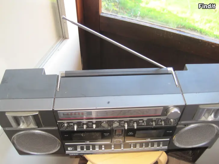 Ostin uutena 80 luvulla maksoin 1200mk. Käytetty keikkasoittimena koska tämä toimii 12v ja sain kannettavan CD soittimen liitettyä tähän. Kaikki toimii, nappulat ,säätimet paikalla ja toimii, patteri ja kasettipesät puhtaat. Tähän saat myös levysoittimen kiinni . Jotakin naarmuja päällä. Leveys 63cm ,korkeus 24cm Made In Japan.