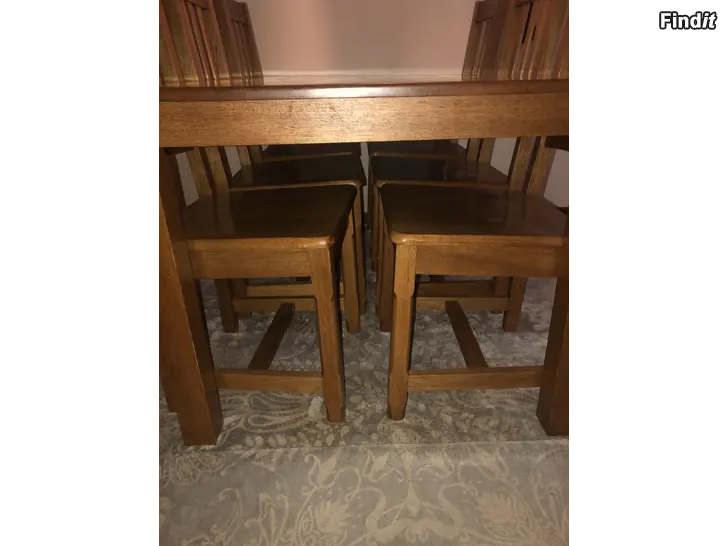 Täyttä puuta. Pöydässä pari hankaumaa, kuvissa, tuolit hyvät. Muuton alta pois. Voin kuljettaa lähialueelle, tarvittaessa pöydän purkaa. Reilusti yli tonnin paketti. Pöytä 165 x 90,5 Korkeus 74cm