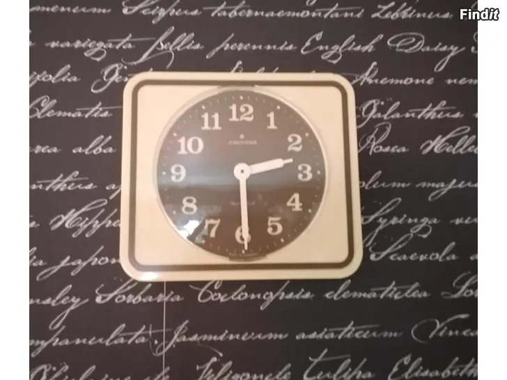 Junghans seinäkello, halkaisija noin 25 cm, muovikuorinen. Naarmuton lasi. Toimii yhdellä paristolla paristo mukana. Kellossa on selkeät numerot ja viisarit, sopii seinälle tai hyllyyn, kuten kuvassa. Voidaan lähettää sop. mukaan, tai kulkeutuu lähialueelle