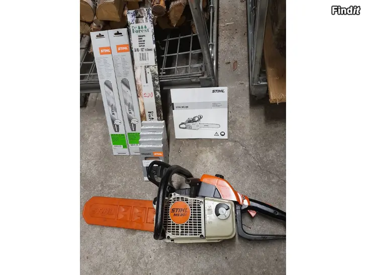 Använd motorsåg i bra skick. Tre nya svärd + fem kedjor.