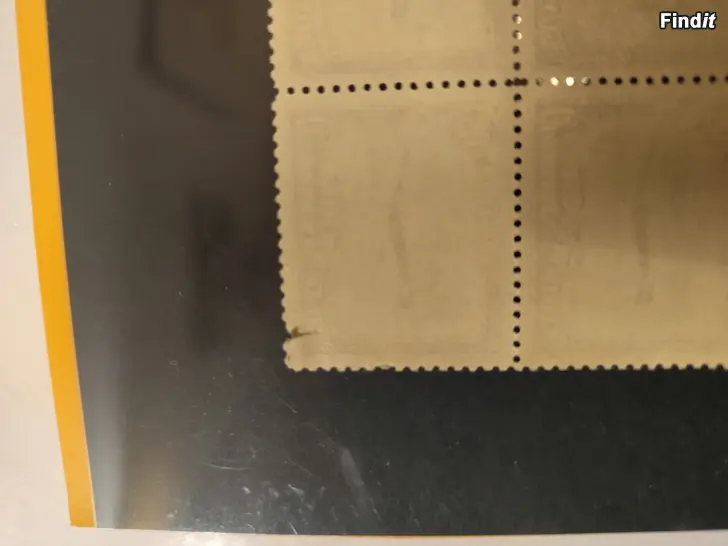Oikean yläkulman merkissä pieni repeymä, jonka erottaa kääntöpuolella.