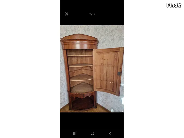 Kulmakaappi. Yläosa 1800 luvulta, jossain vaiheessa joku tehnyt alaosan, näkyy kuvasta kaapin takaa. Mielestäni suhtkot onnistunut toteutus.