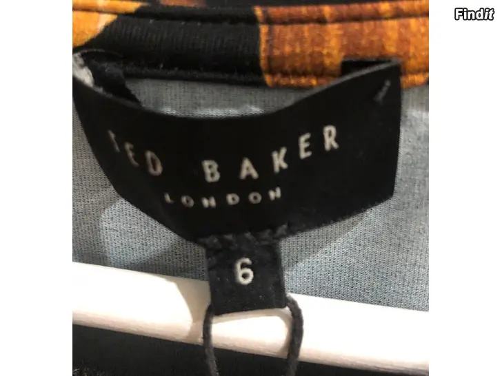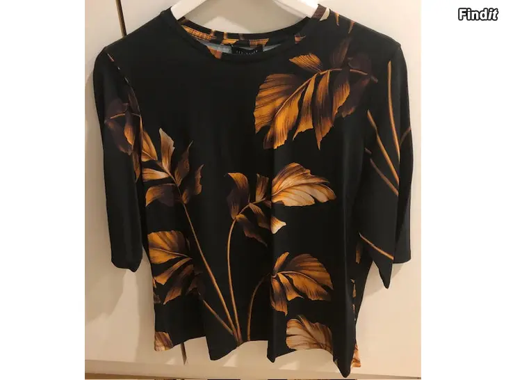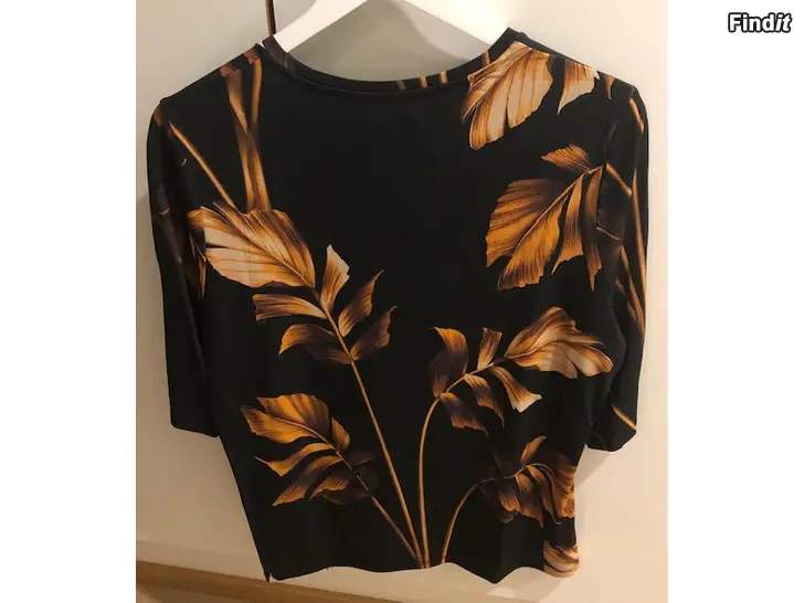 Musta pohja kullanruskeankeltaiset lehdet, kangas viskoosi 91 elastaani 9. Hyvin joustava materiaali. Mitat kai-kai 57cm, pituus 65cm, hihanpituus 39cm. Hihat ovat kyynärpäähän. Koko 6, englanti. Postitetaan tarvittaessa.