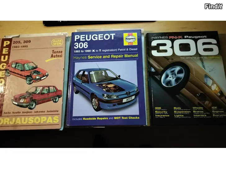 Myynnissä Peugeot 205/309 Alfamer, 306 Haynes, korjaus/huolto käsikirjoja, lisäksi tuo kuvassa viimeinen Haynesin/Max Power tuning kirja 306:een
