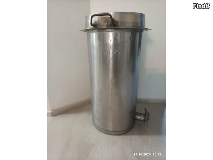 Teräksinen astia hanalla. Korkeus 80 cm, halkaisija 33 cm. Tilavuus n. 50 l.